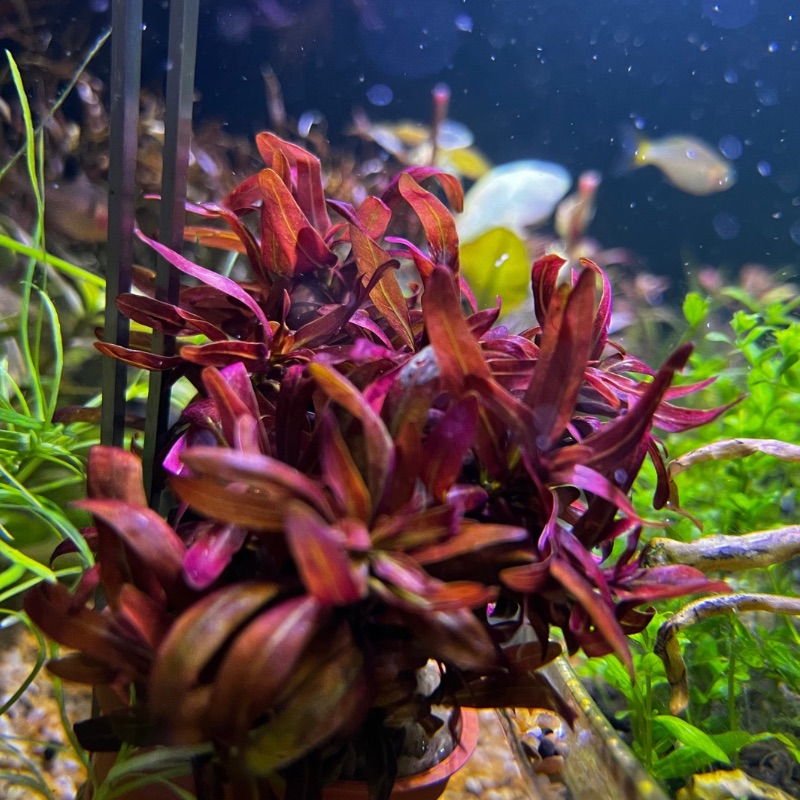 La Rotala ramosior ‘Sunset’ es una planta de tallo altamente decorativa, famosa por sus tonalidades rosadas, anaranjadas y rojizas en las puntas cuando se cultiva en condiciones adecuadas. Aporta luz, profundidad y un efecto “sunset” muy llamativo en acuarios plantados bien balanceados.